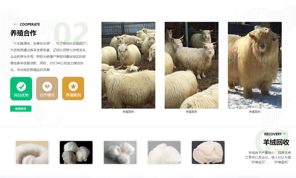 遼甯絨山(shān)羊絨毛開(kāi)發有(yǒu)限公司采用(yòng§β)“公司+銀(yín)行(xíng)+保險+農(nónφ♠<g)戶”的(de)經營模式,秉承“精誠合作βλ☆(zuò)、共謀發展、互惠互利”的(de)原★€¥δ則,與國(guó)內(nèi)多(duō)φ≠®家(jiā)銀(yín)行(xíng)建立深度合作(zuò),為(wèi)∞ ↕養殖戶墊付購(gòu)羊資金(jīn),扶持養殖戶養殖遼甯絨山(s♣♣σhān)羊,并簽訂羊絨長(cháng)期回收合同,帶領£γ¥↔千家(jiā)養殖戶走向緻富路(lù)。同時(shí),遼甯σ®α絨山(shān)羊絨毛開(kāi)發有(yǒu)限公司ε♠與數(shù)家(jiā)羊絨制(zhì)品廠(chǎng)商、知(zh₽↓→ī)名針織廠(chǎng)商保持長(cháng)期合作(zuγ€ò)關系,并保證絨山(shān)羊的(de)原絨供給。